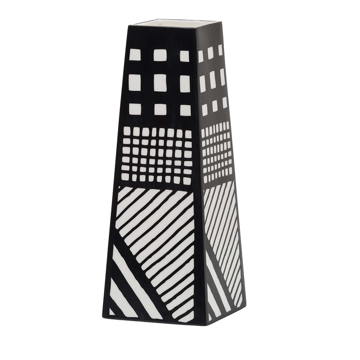 This ceramic vase designed in 2018 by industrial designer George Sowden will make an elegant statement on a dining room console or a table in a modern and contemporary interior. Marked by a sleek, truncated-pyramid shape, this piece showcases a mix of graphic patterns on a white background. This vase can be displayed with similar pieces from the same collection or used to showcase a single-stem flower. Materialism Collection.