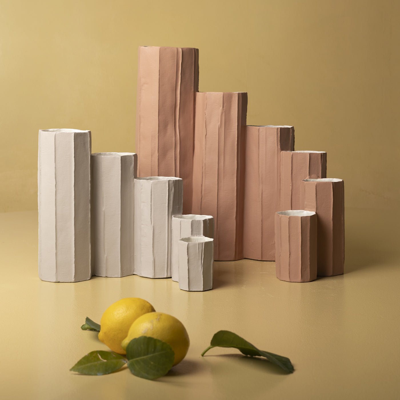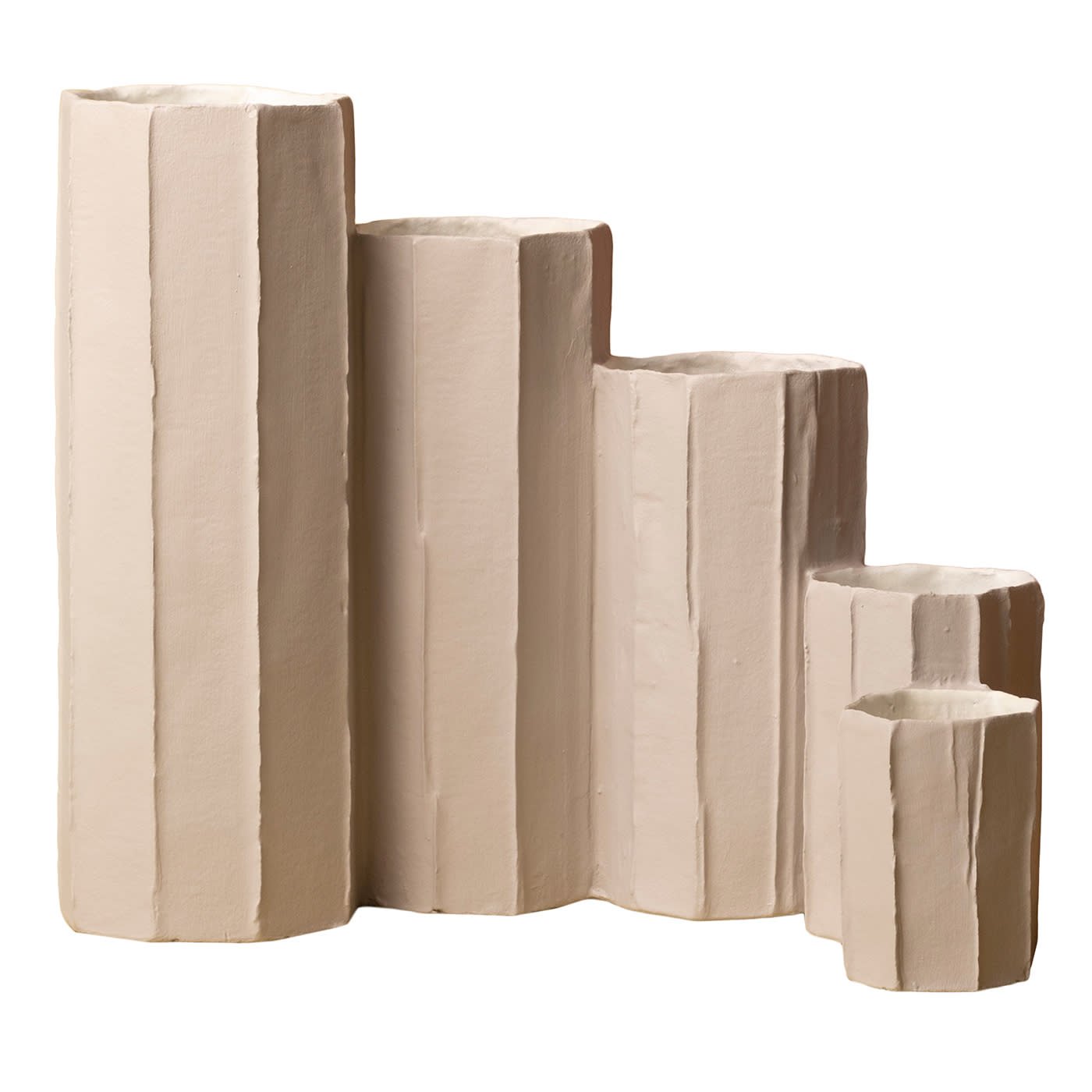 The Bruco vase presents a striking piece of home décor that draws inspiration from the natural world. This decorative vase features a composition of volumes distinguished by varying heights and diameters, creating sinuous paths that play with shadows, textures, and hues. Its unique design can evoke imagery of clustered tree trunks, architectural skylines, dizzying staircases, or organ pipes, allowing the imagination to take flight into a realm of fantasy. Crafted with meticulous care, this vase not only serves as a functional object but also stands as an artistic statement within any space. Its versatile beige tone seamlessly integrates into diverse interior styles, making it an ideal choice for enhancing both modern and classic décor settings.