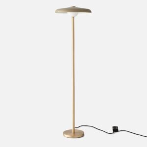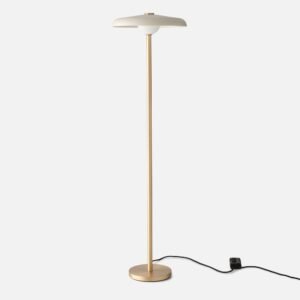 With a pure form and low-profile design, the Caldera Floor Lamp represents utilitarian lighting at its most handsome. Designed by local Portland studio FOLK, it has a metal shade and handblown glass diffuser that softly cast light downward and outward. A solid brass base gives it an extra elegant touch.