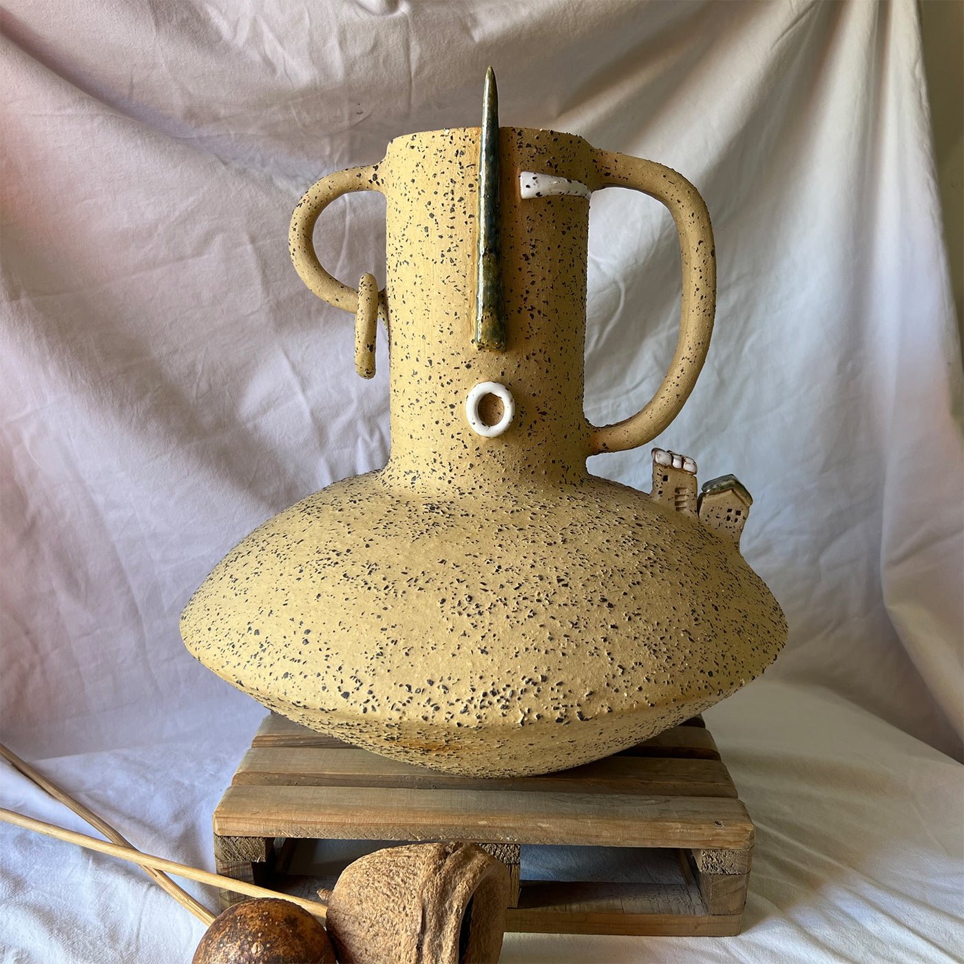 Part of the Emozionale Collection, this sculptural vase embodies a powerful presence, evoking the collective memory of dwelling and belonging. Its bold, evocative form becomes a symbolic guardian of identity, while the interplay of raw, textured surfaces and delicate glazed accents adds depth and character. The earthy tones and subtle ash-glaze details enhance its expressive, timeless aesthetic, making it not just a vessel but a poetic statement piece. A unique artwork that blends emotional resonance with sculptural elegance. Each piece varies slightly in shade and form, highlighting its unique, poetic character.