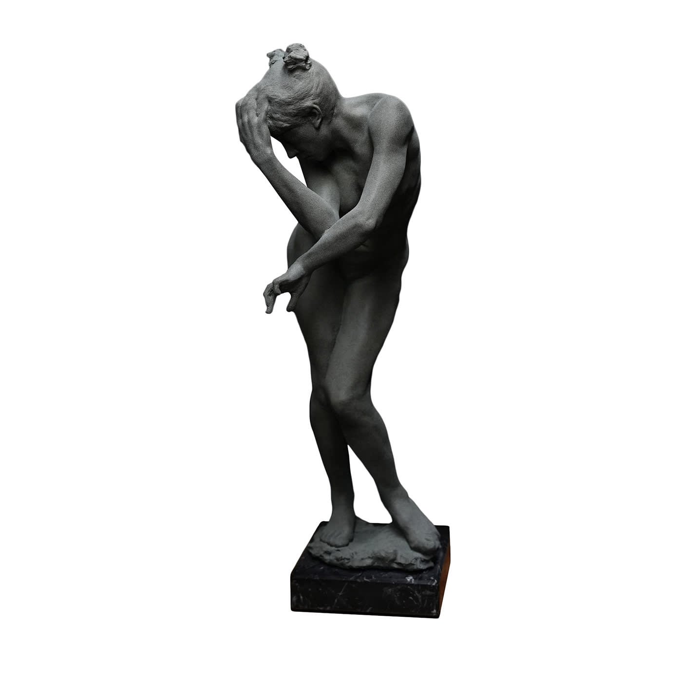 Ewe is a dark gray resin sculpture that embodies the fragility of humanity in a moment of profound introspection. Sculpted with remarkable precision, this female figure reveals a posture of vulnerability and contemplation, arms crossed, head tilted in silent reflection. Every curve and fold of skin dances between light and shadow. This piece is not just decorative; it’s a journey into the soul. Each piece is unique, due to handcrafting, slight changes may occur.