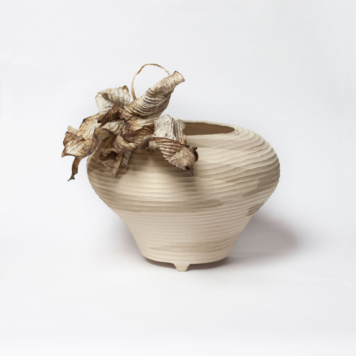Favo, inspired by a honeycomb, is part of a ceramic series based on the nests of pollinating insects, particularly bumblebees. Fired at high temperature and raised on feet, the vase is crafted from white, beige, and light brown stoneware. Its asymmetrical, carved horizontal patterns evoke the beauty of nature and celebrate biodiversity. Favo is a unique piece celebrating nature’s beauty.