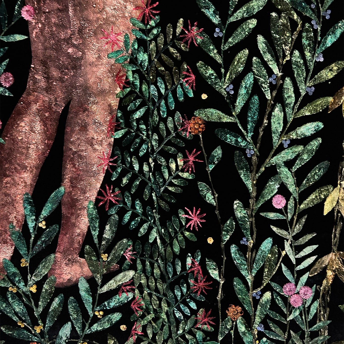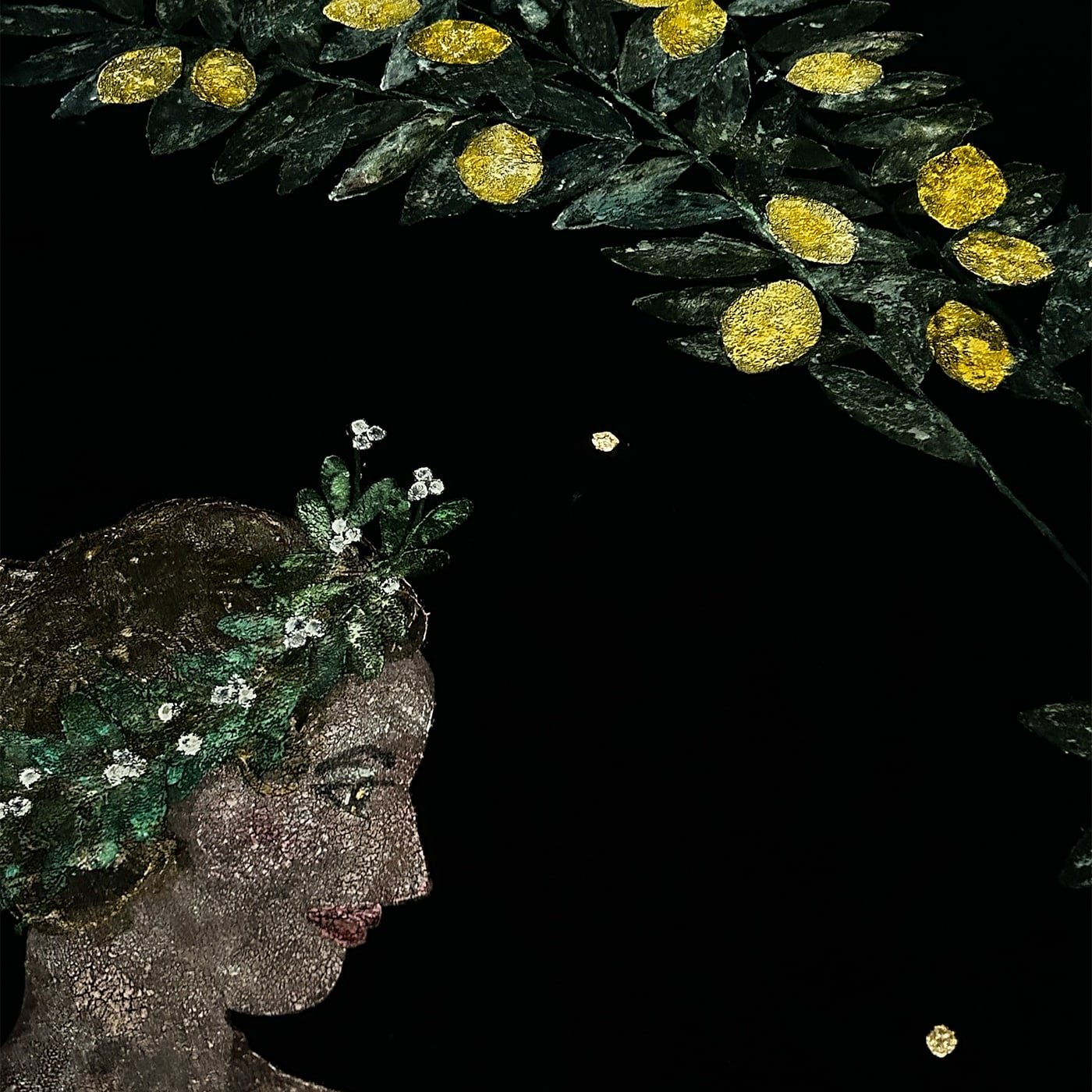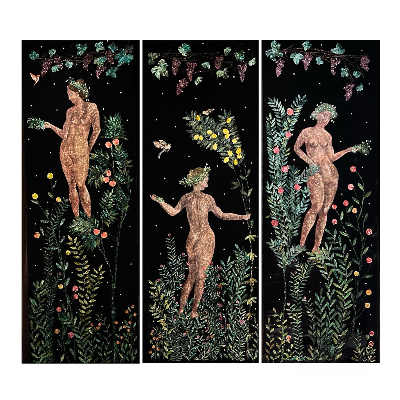 “Florae Incantata” is a large tapestry divided into three panels, merging the aesthetic of ancient Rome with modern silk velvet. It portrays three female figures inspired by Roman goddesses and nymphs, emerging from a lush garden of leaves, flowers, and fruit trees against a deep black velvet background. The intricate design features emerald greens, vibrant yellows, and natural tones with gold leaf accents, creating a luminous, three-dimensional effect that evokes abundance and timeless beauty. Each panel in the triptych can also be purchased individually.