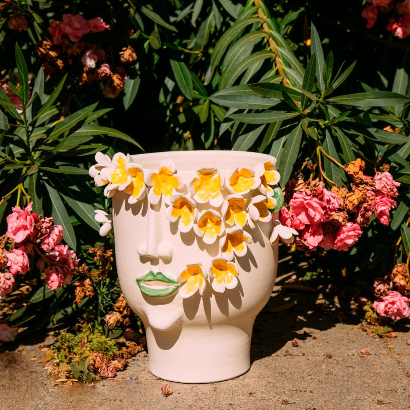 Extraordinarily crafted and decorated by hand according to the ancient Sicilian traditions of Moor’s heads manufacturing, this gorgeous ceramic sculpture can be used as a flowerpot as well as a decorative objet d’art in both indoor and outdoor decors. Enriched with elegant applications of Plumeria flower, it is enameled with a cream white tone and green and orange details.