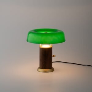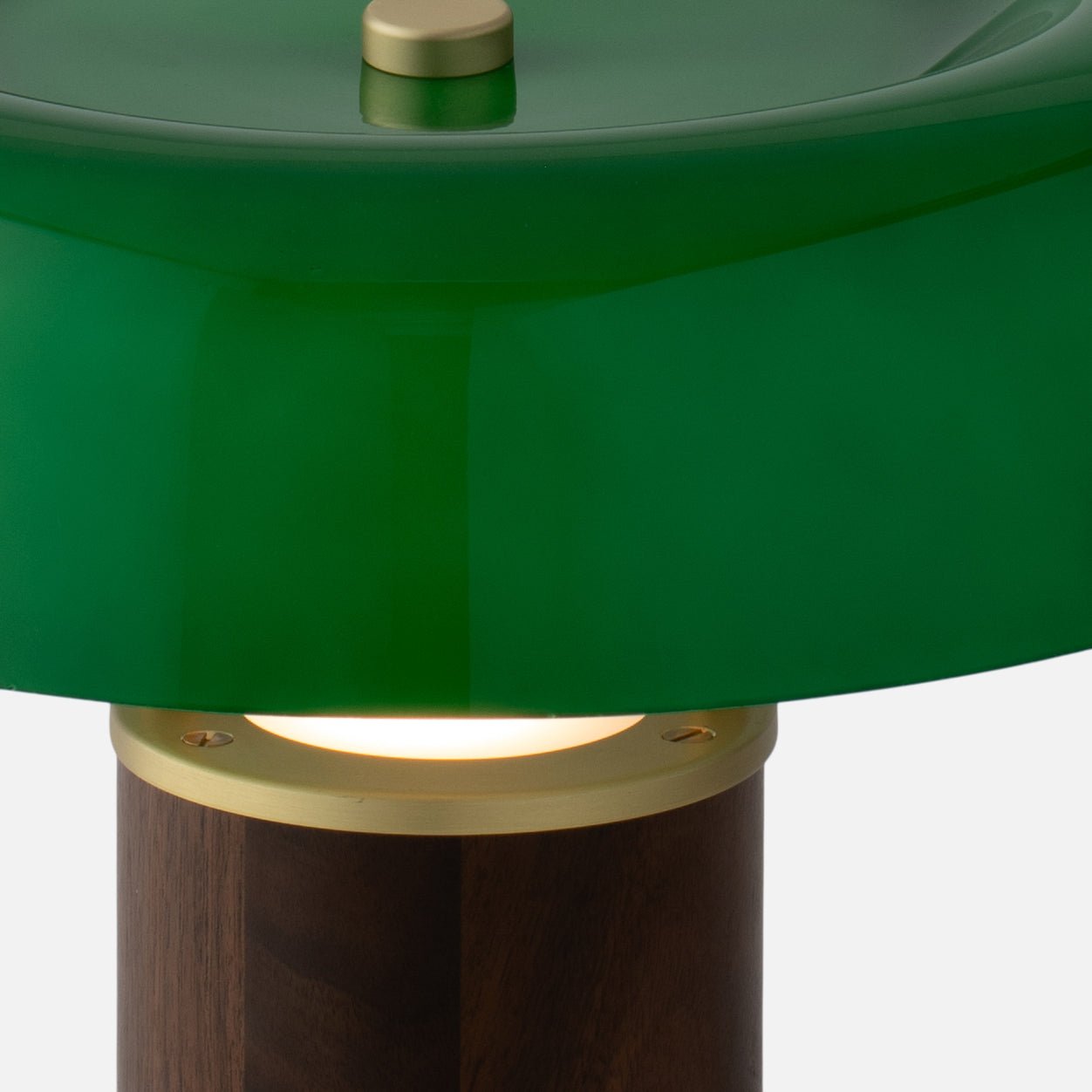A timeless icon, reimagined. Franklin honors the classic bankers lamp with a fresh twist, pairing the signature green glass with solid walnut wood and natural brass accents. Its silhouette and materials are thoughtfully redesigned to highlight the lamp’s vibrant glow. Light gently rises from the solid wood base into the shade, intensifying the iconic green glass glow while casting a warm reflection onto your desk or table. Fully dimmable, so you can set the perfect mood through the glow of the shade.