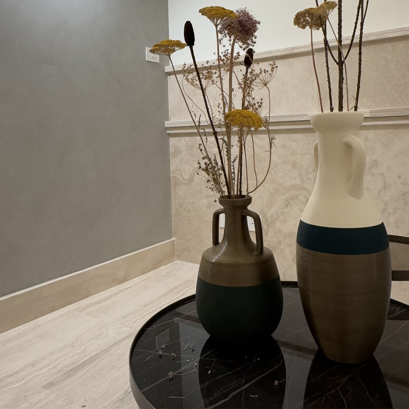 This vase is a large-scale reinterpretation of classical roman amphorae, inspired by the typological table by heinrich dressel from monte testaccio. Using advanced 3D printing technology, this vase transforms pla filaments derived from renewable resources into a distinctive silhouette characterized by a bronze body, black band, and milk-colored neck and handles. Designed to blend archaeological heritage with modern innovation.
