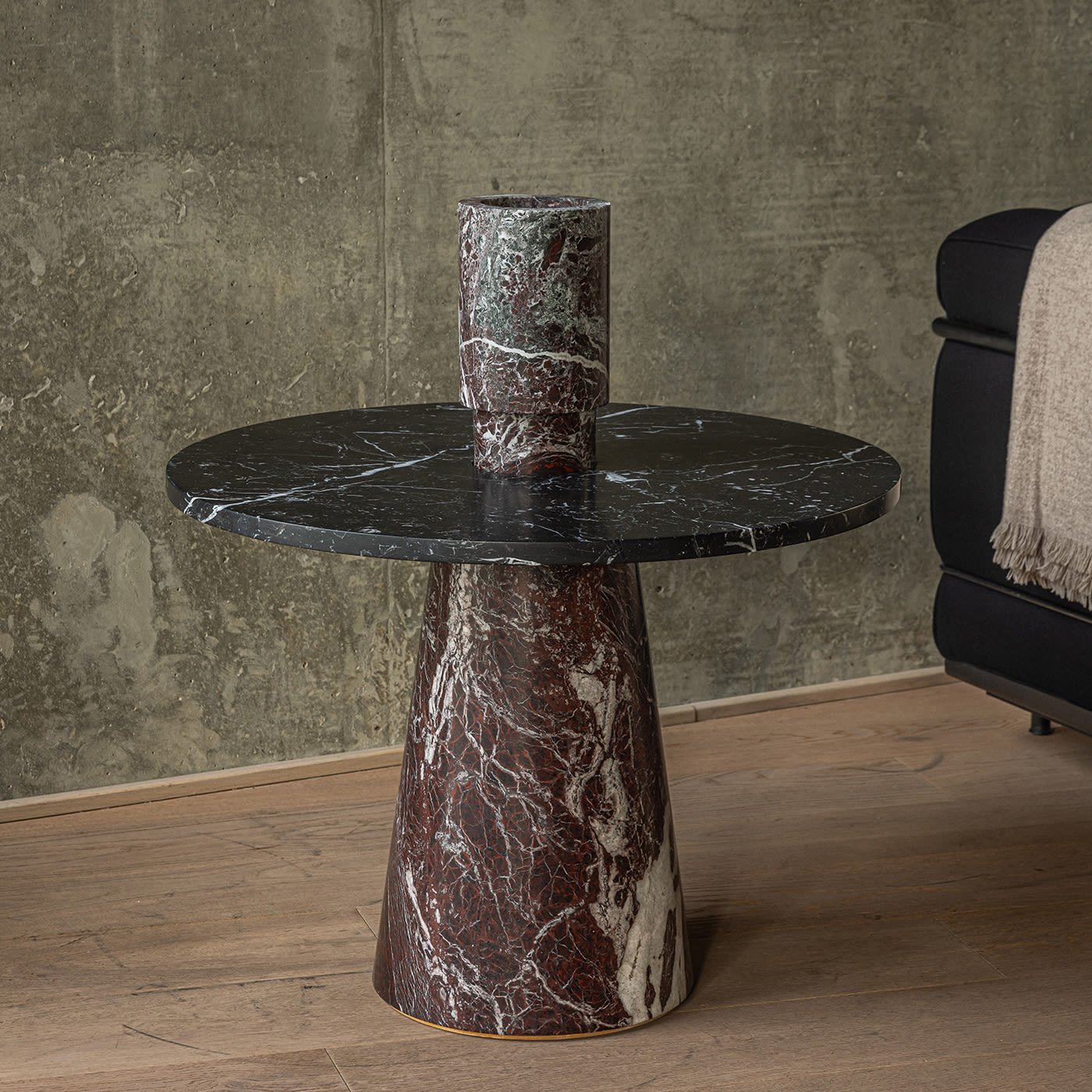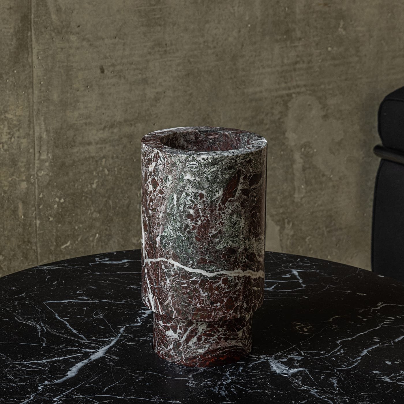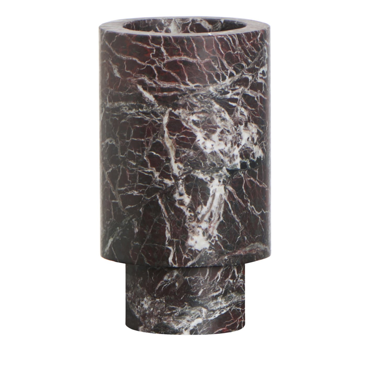 Crisp white veins define the eye-catching quality of red Levanto marble, prized stone employed to craft this stunning vase. Designer Karen Chekerdjian conceived it as an interlocking accessory to be incorporated with the tabletops of the designs from the Inside Out Collection. Consisting of two different-sized, stacked cylinders, this stylish piece is also ideal as a freestanding vase to splendidly display fresh flowers in any corner of the house. Please note that marbles and stones are natural materials and they can differ also if coming from the same quarry or the same block. The product shown may differ from purchased items. Every piece is unique.