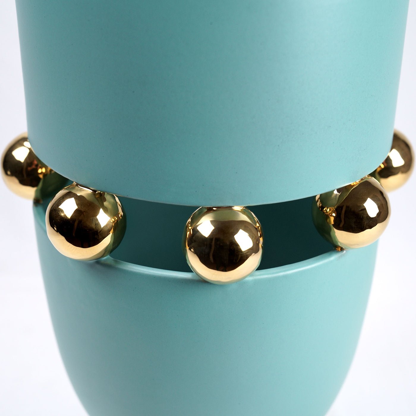 Kósmos Aquamarine vase features a matte aquamarine finish accented with 24kt gold luster, achieved through a unique three-stage firing process that enhances the gold’s reflective quality. The design balances simplicity with intricate craftsmanship, as the vase is created in one piece without assembly or glue. A stamped mark ensures authenticity, showcasing a refined artistry for sophisticated décor settings. Each piece is entirely handcrafted, so slight variations from the image may occur.