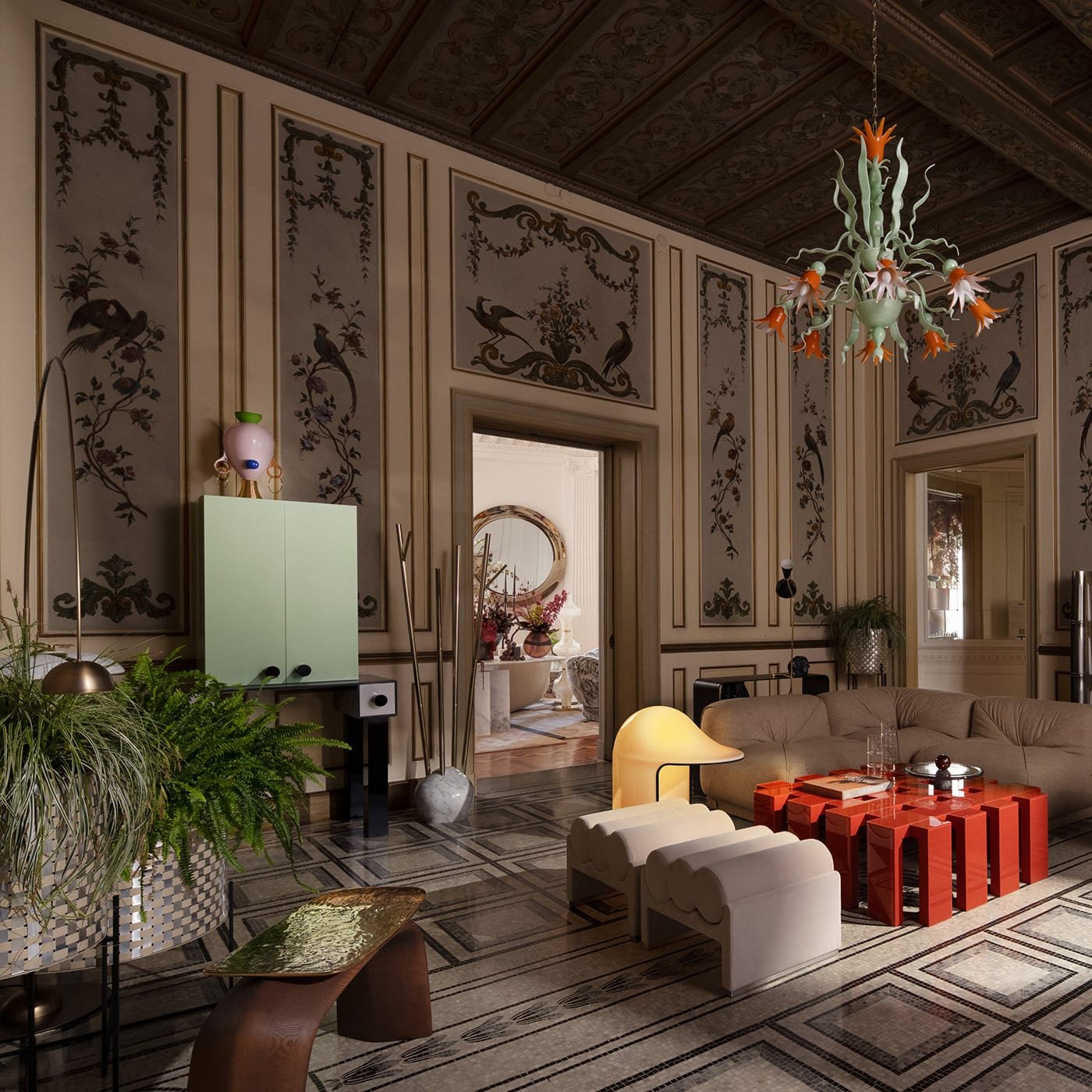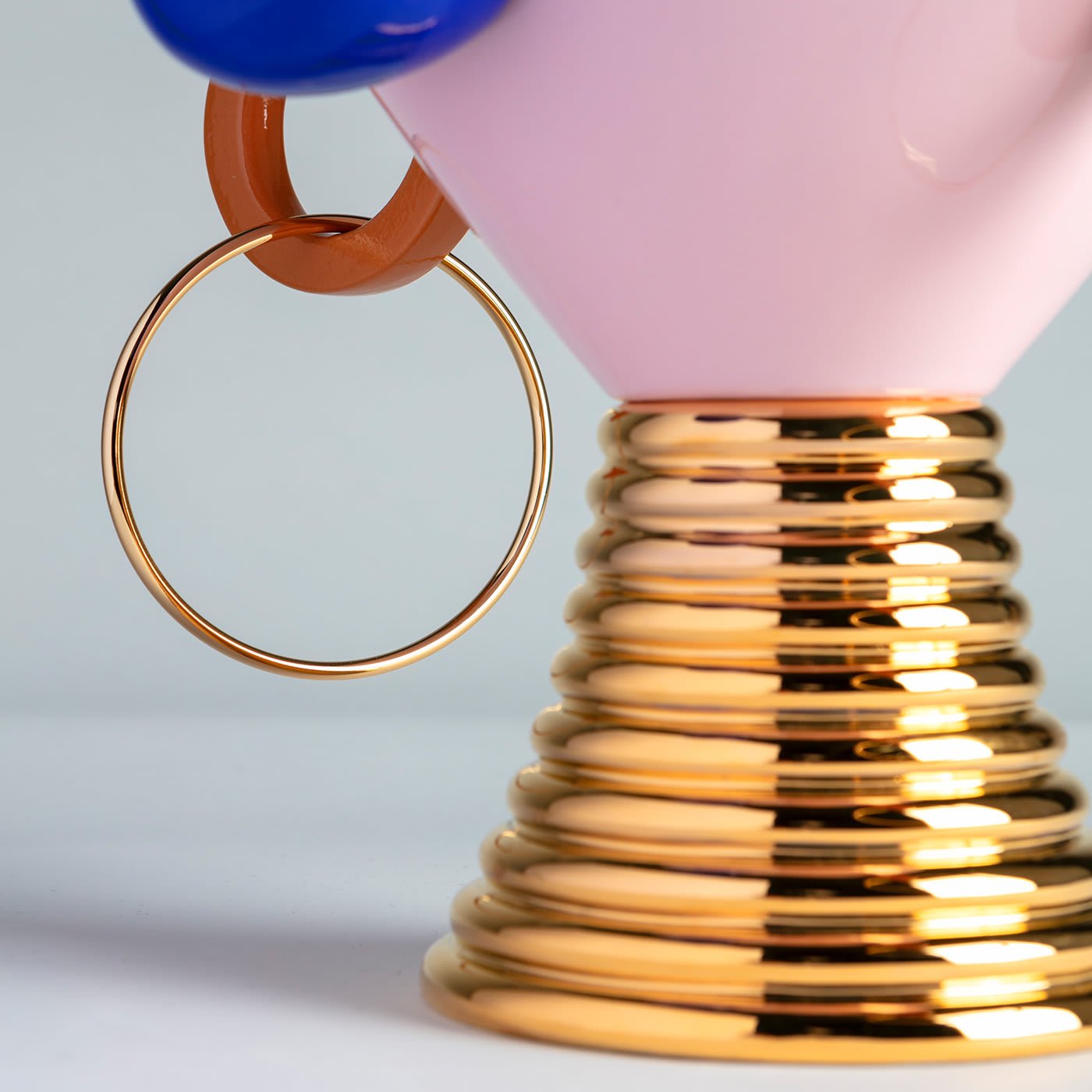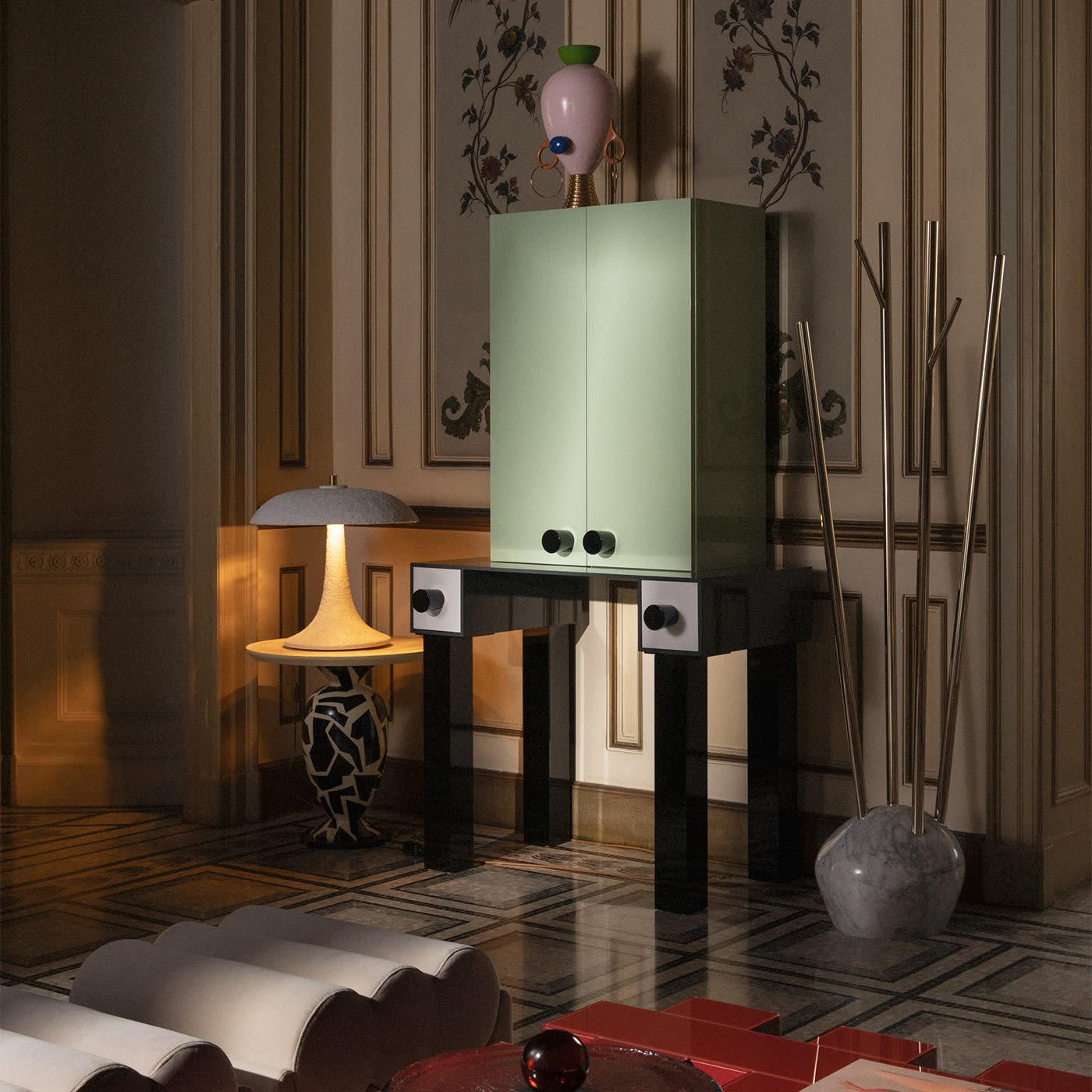 Inspired by the singular and striking aesthetic of tribal cultures, this magnificent vase depicts the archetypal figure of a mother, rendered in a superlative combination of bold tones and unconventional geometric lines. Handcrafted of ceramic and painted by hand, it is enhanced with glossy and matte finishes, chromed details, and a pair of shiny metal earrings.