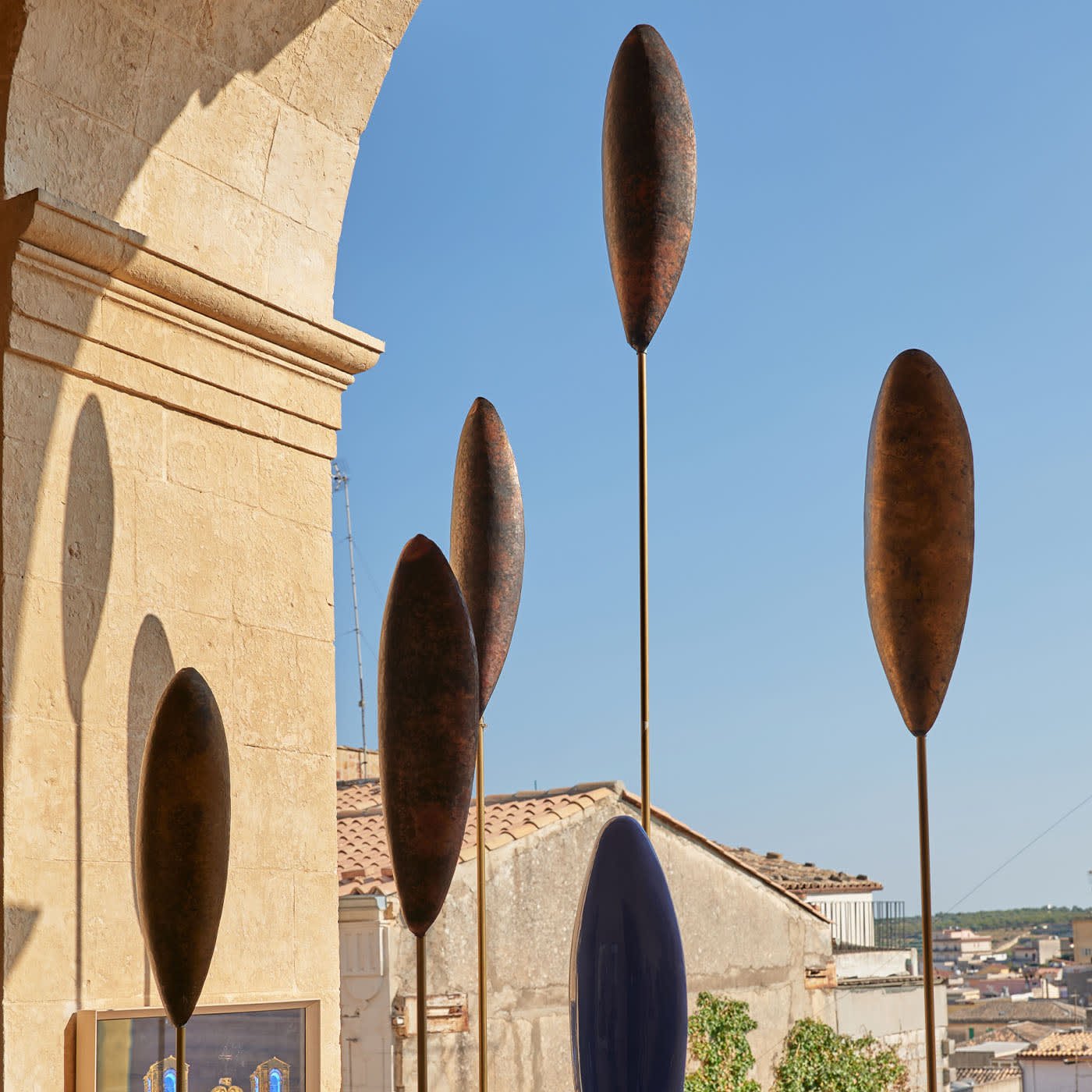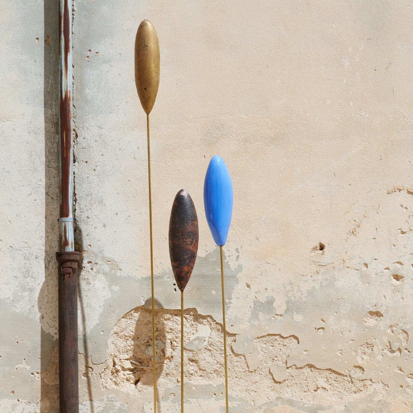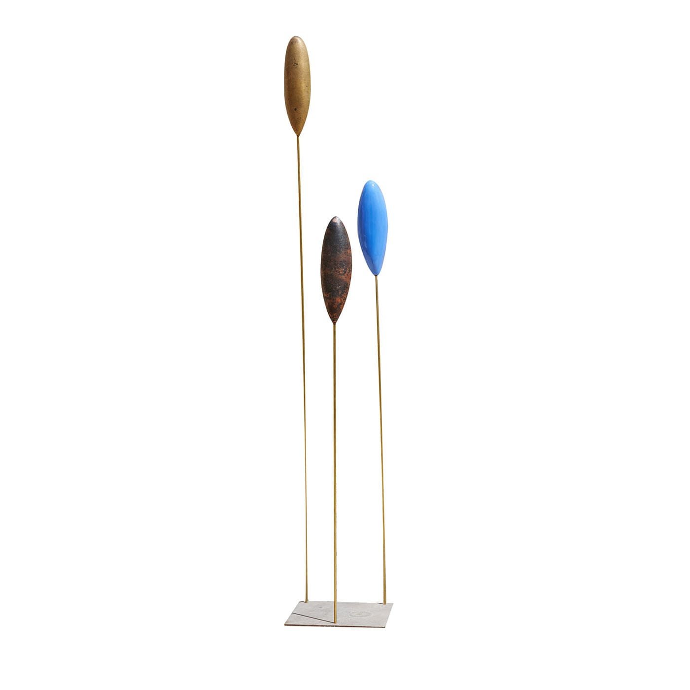 Totem pole with brass, embossed copper, and ceramic elements. Composed of three brass tubes and elements that can be made of blue ceramic glazed, embossed brass, and embossed copper. It is entirely modular and the heights of the tubes are variable. Also available with only the brass and copper elements.