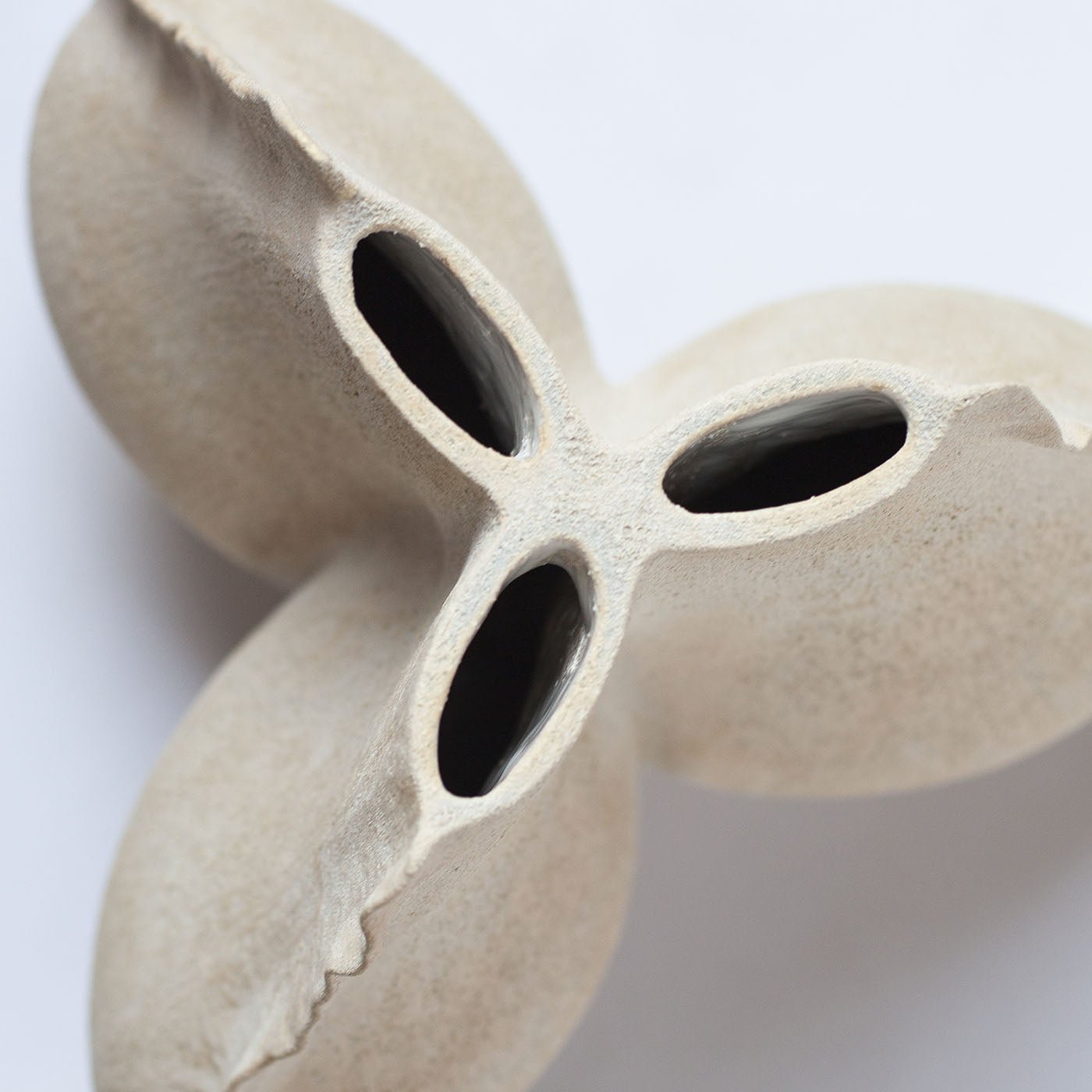 Ossa is a collection of artistic ceramics inspired by plant seed pods, natural containers that protect and preserve the essence of life. Much like bones in the human body, these wooden shells serve as protective structures for seeds. The diversity of forms found in nature’s capsules has been a constant source of fascination. Some pieces in the Ossa collection closely reflect the botanical features of their plant inspiration, while others abstract their organic shapes into sculptural forms. What unites them is a single purpose: to celebrate life in all its myriad expressions. This vase is handcrafted from white stoneware, glazed and fired at high temperatures. The interior features a glossy optical white finish, while the exterior has a tactile, matte ivory surface. Its design is inspired by the seed pod of the Iris flower. Unique piece.