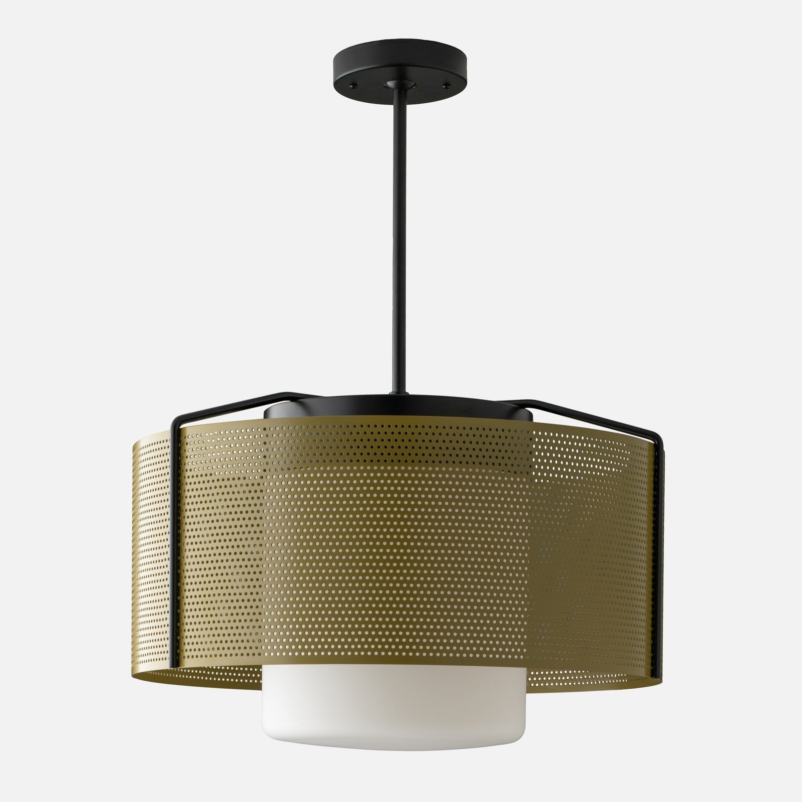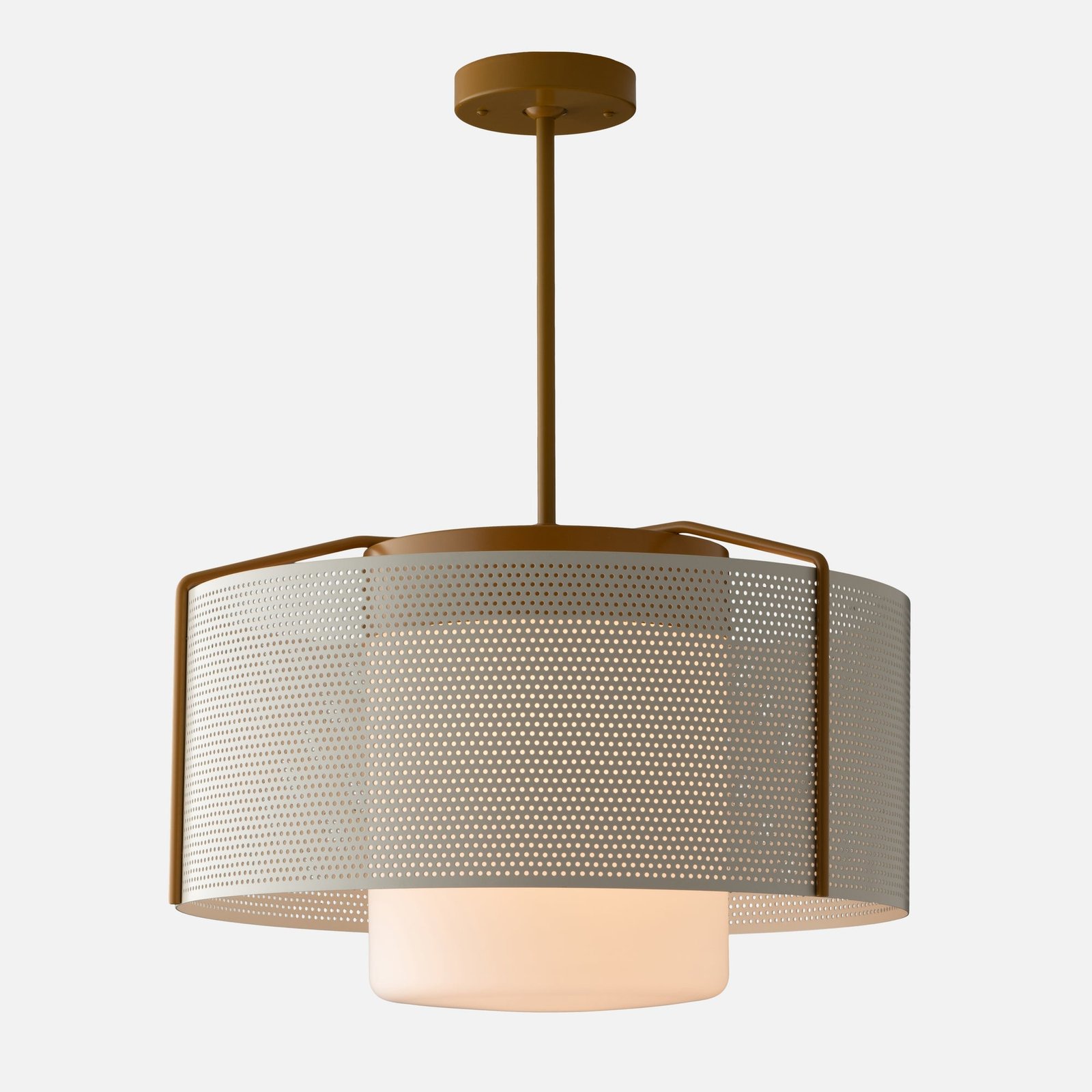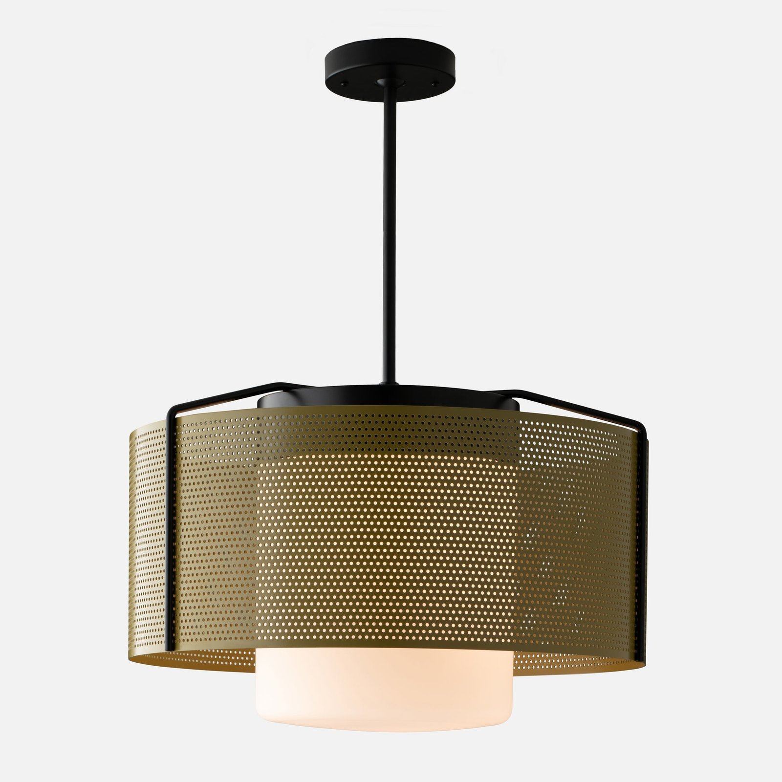 Equal parts classic and cool, this pendant takes its cues from mid-century industrial lighting—with a fresh twist. The perforated metal shade creates a playful mix of light and shadow, while the frosted glass diffuser softens the glow. Hang it over a dining table, kitchen island, or anywhere that deserves a moment to shine. A Schoolhouse Original.