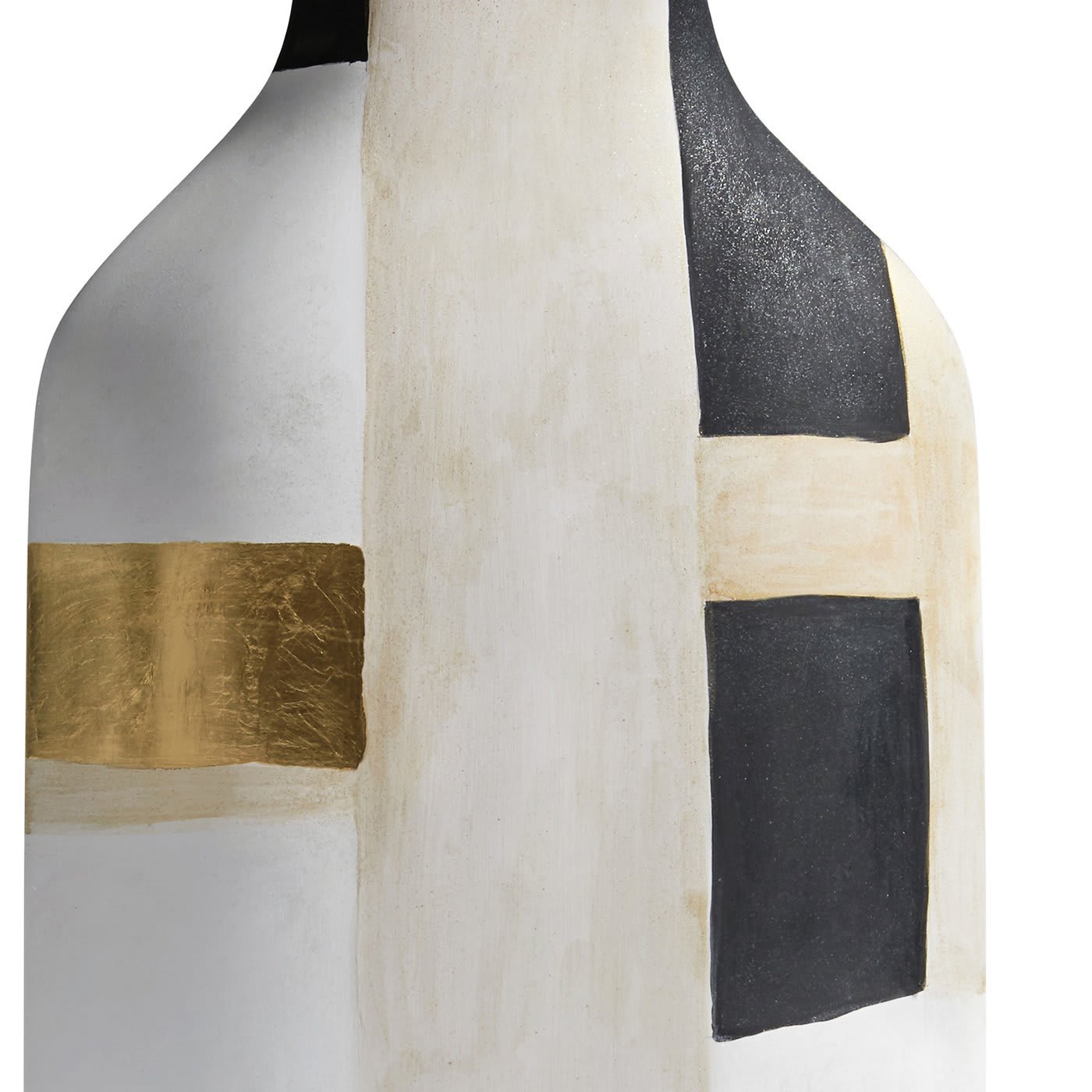 This sophisticated handmade ceramic vase features a simple silhouette and contemporary decorations that were applied by hand. Part of a limited edition of 50 pieces, this vase features a white finish with abstract black decorations and touches of real gold leaf that brighten its surface with a precious glow of warm light. Alone or paired with other pieces from the Palma series, this object is a magnificent example of modern decoration.
