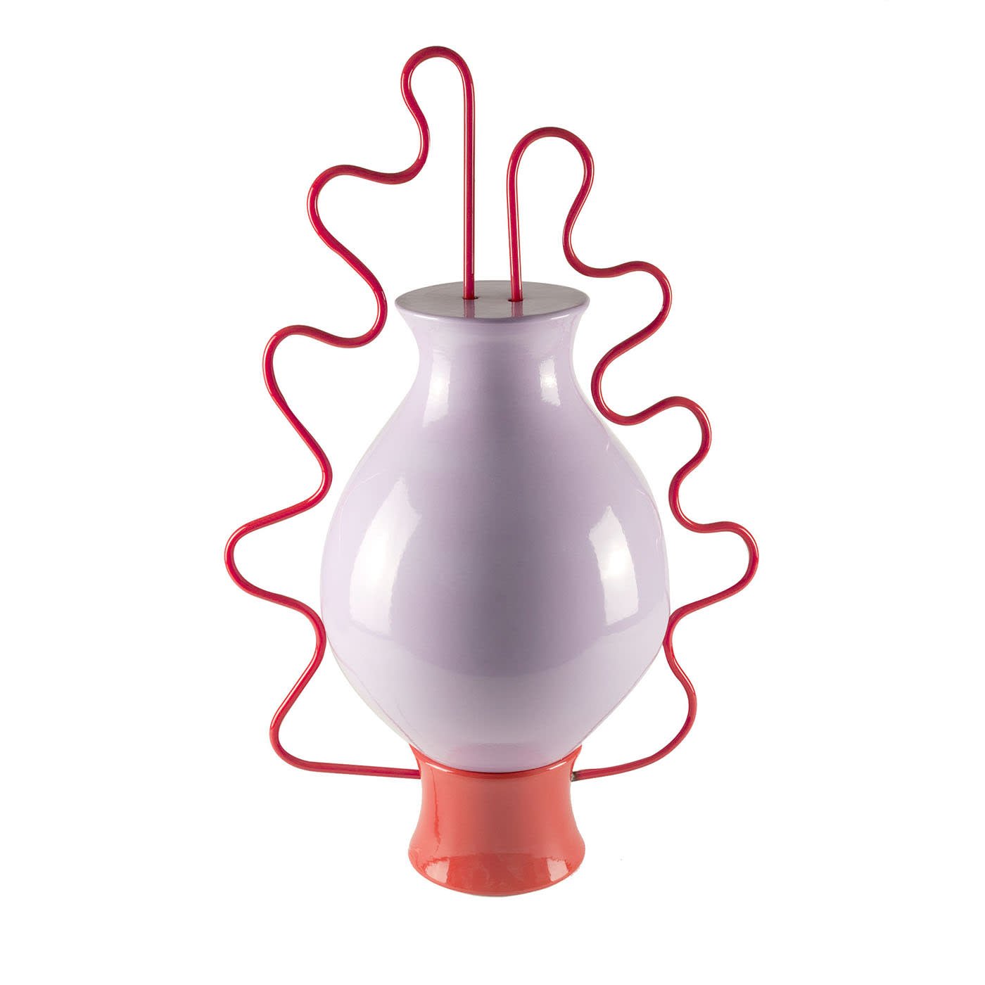 Vaso from the “Flowers Of Light” collection, is a luminous sculpture in glazed ceramic and neon. Vaso is one of the most important pieces of the collection in terms of size and light. The neon is in red paste in Murano glass. The two-piece ceramic, one lilac, a color much loved by the designer, and one red, was created in the city of Ceramics Nove. When turned on, the luminous sculpture invades the space with a beautiful red light.