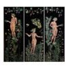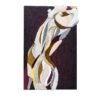 This figurative painting depicts a distorted, indistinct human figure reclining on a yellow armchair near a dark violet wall. The figure, a blend of flesh and fabric with ambiguous anatomical features, conveys vulnerability. Dramatic lighting enhances strong contrasts, emphasizing a theatrical and claustrophobic atmosphere. The color palette ranges from muted earth tones to sudden violet highlights, evoking an inner emotional conflict.