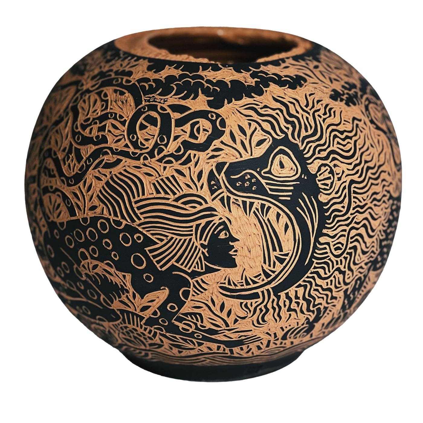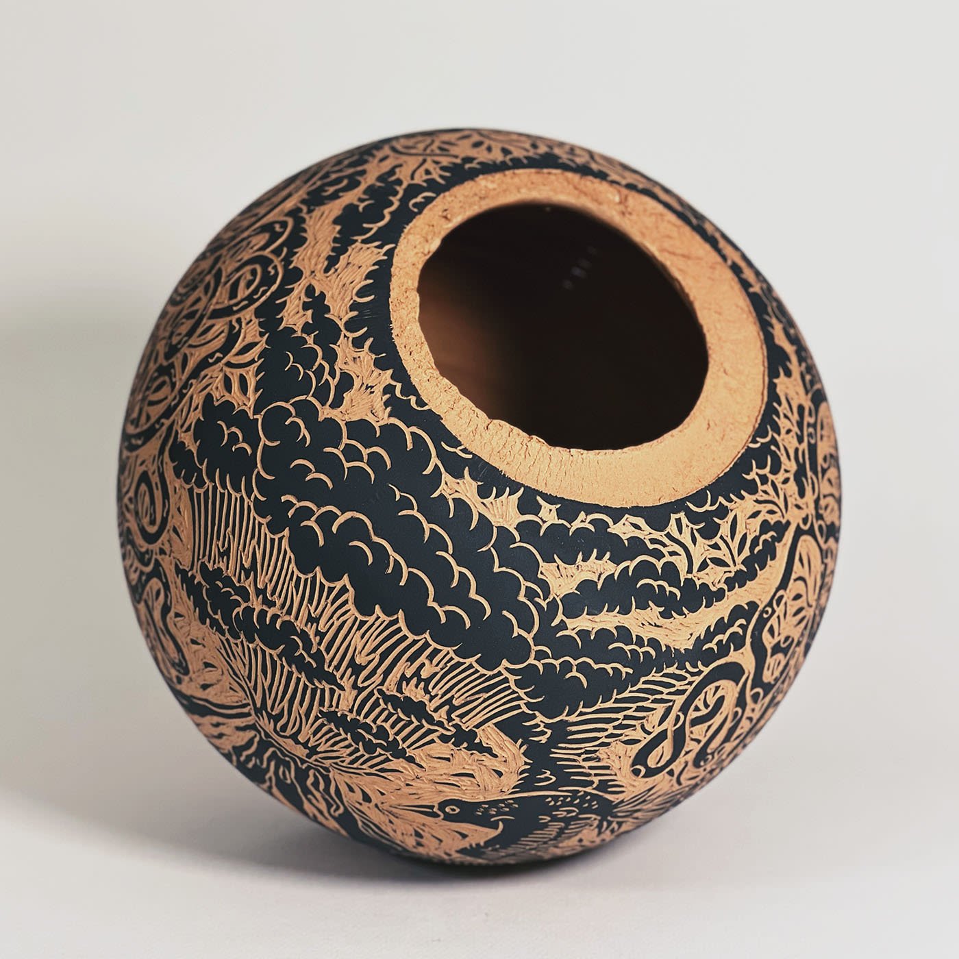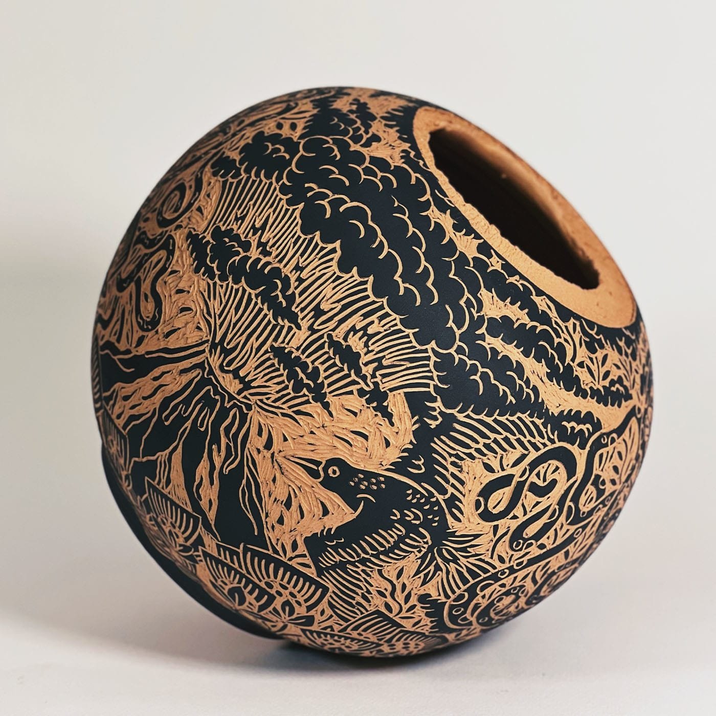 “I’ll only hurt you if you let me”. Wheel thrown round vase made of terracotta and black engobe.