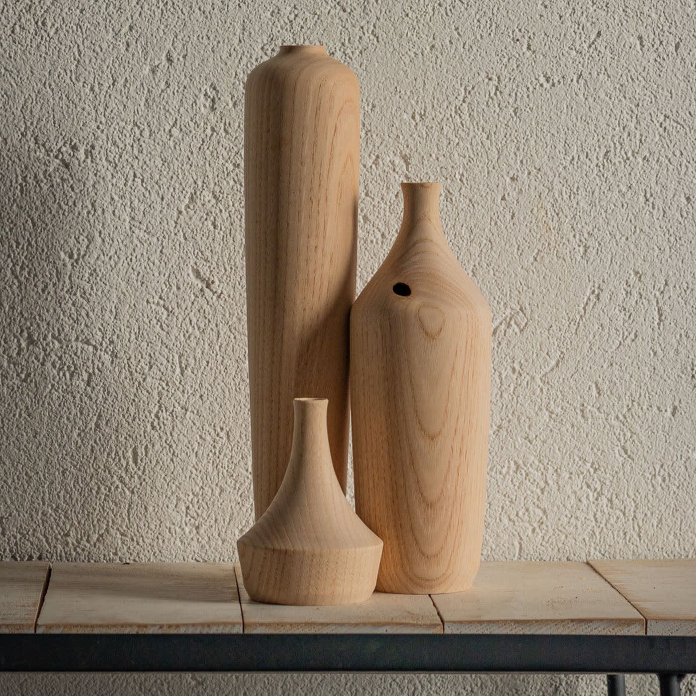 Designed to host dried flowers or simply serve as a decorative statement, this set of vases will add a charming touch to rustic and minimalist interiors, alike. Expertly molded out of chestnut wood, this set features two distinctive silhouettes (one tall and one squat) that highlight the exquisite wood grain. Upon request, the wood can be treated with specific oils to prevent soiling, in which case the color will tend to darken. Do not fill or immerse with water, clean only using a damp cloth